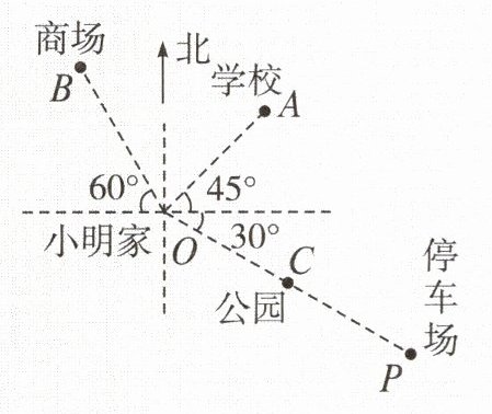 (2)商场在小明家北偏西30°方向,学校在小明家东北方向,公园和停车场都在小明家南偏东60°方向。
