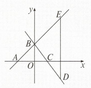 (2)在 $ BC $ 延长线上取点 $ D $,使 $ DC = BC $,过点 $ D $ 作 $ DE \perp x $ 轴交 $ AB $ 的延长线于点 $ E $,记 $ \triangle ABC $ 的面积为 $ S_1 $, $ \triangle BDE $ 的面积为 $ S_2 $,求 $ \frac{S_1}{S_2} $ 的值。