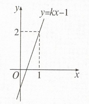 3. 如图,函数$y = kx - 1$的图象过点$(1, 2)$,则关于$x$的方程$kx - 1 = 2$的解是$\underline{\hspace{2em}}$。