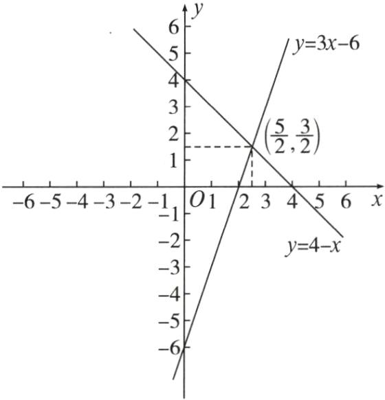 因为两条直线的交点坐标是$(\frac{5}{2}, \frac{3}{2})$,所以方程组$\begin{cases} 3x - y = 6, \\ x + y = 4 \end{cases}$的解是$\begin{cases} x = \frac{5}{2}, \\ y = \frac{3}{2}. \end{cases}$