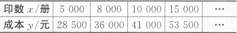 $(k \neq 0)。$由表中数据知,当x = 5000时,y = 28500;当x = 8000时,y = 36000。把它们分别代入函数表达式中,得$\begin{cases}5000k + b = 28500,\\8000k + b = 36000.\end{cases}$解得$\begin{cases}k = \frac{5}{2},\\b = 16000.\end{cases}$所以所求一次函数表达式为$y = \frac{5}{2}x + 16000。$(2)当y = 48000时,$48000 = \frac{5}{2}x + 16000,$解得x = 12800。所以能印该读物12800册。