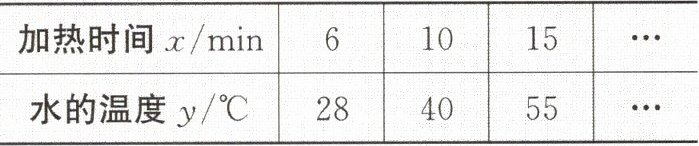 2.在探究“水沸腾时温度变化特点”的实验中,发现在水沸腾前,水的温度$y$(单位:$° C$)与加热时间$x$(单位:$\min$)之间满足一次函数关系,下表记录了实验中水的温度$y$与加热时间$x$变化的部分数据。