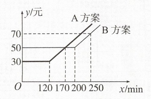 5.某电信公司提供的A,B两种方案的移动通信费用$y$(单位:元)与通话时间$x$(单位:$\min$)之间的关系如图所示,若通信费用为$62$元,则B方案比A方案的通话时间多