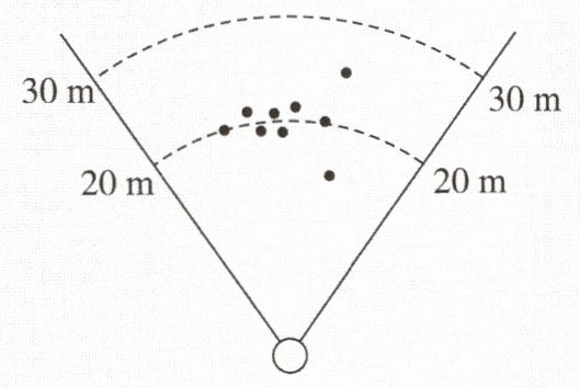 5.小丽进行投掷标枪训练,总共投掷$10$次,前$9$次标枪的落点如图所示,记录成绩(单位:m),此时这组成绩的平均数是$20$m,方差是$s^2_1$。若第$10$次投掷标枪的落点恰好在$20$m线上,且投掷结束后这组成绩的方差是$s^2_2$,则$s^2_1$