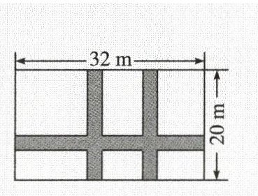 7. 如图,某小区计划在一块长为 $32\mathrm{m}$、宽为 $20\mathrm{m}$ 的矩形空地上修建三条同样宽的道路,剩余的空地上种植草坪,使草坪的面积为 $570\mathrm{m}^{2}$,若设道路的宽为 $x\mathrm{m}$,则下面所列方程正确的是(