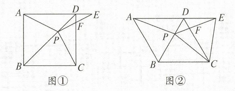 22. (10 分)如图①,在正方形 $ABCD$ 中,$P$ 是 $BD$ 上的一点,点 $E$ 在 $AD$ 的延长线上,且 $PA = PE$,$PE$ 交 $CD$ 于点 $F$.