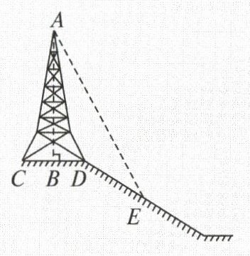 14. 如图,在斜坡的顶部有一铁塔$AB$,$B$是$CD$的中点,$CD$是水平的,在阳光的照射下,塔影$DE$留在坡面上. 已知铁塔底座宽$CD = 12m$,塔影长$DE = 18m$,小明和小华的身高都是$1.6m$,同一时刻,小明站在点$E$处,影子在坡面上,小华站在平地上,影子在平地上,两人的影长分别为$2m$和$1m$,则塔高$AB=$