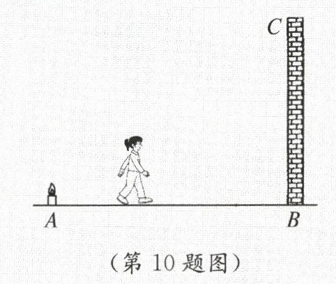 10. 如图,地面$A$处有一支燃烧的蜡烛(长度不计),小红在$A$处与墙$BC$之间走动,则她在墙上的投影长度随着她离墙的距离变小而