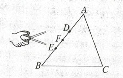3. 三角形纸片 $ABC$ 如图所示,其中点 $D$ 和点 $E$ 将 $AB$ 分成三等份,点 $F$ 为 $DE$ 中点. 若小慕从 $AB$ 上的一点 $P$,沿着与直线 $BC$ 平行的方向将纸片剪开后,剪下的小三角形纸片面积为 $\triangle ABC$ 的 $\frac{1}{3}$,则下列关于 $P$ 点位置的叙述,正确的是(