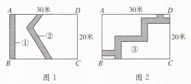 4. 如图1,计划在长为30米、宽为20米的矩形地面上修筑两条同样宽的道路①、②(图中阴影部分),设道路①、②的宽为x米,剩余部分为绿化。