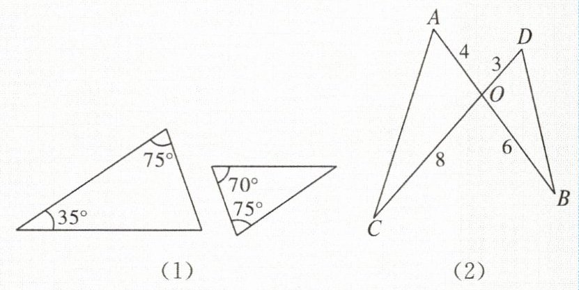 1. 已知图(1)、(2)中各有两个三角形,其边长和角的度数已在图上标注,图(2)中AB,CD交于O点,对于各图中的两个三角形而言,下列说法正确的是(
