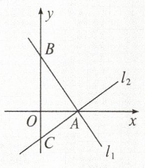 1. 如图,直线$l_1:y=-\frac{4}{3}x+4$与x轴交于点A,与y轴交于点B,直线$l_2:y=\frac{3}{4}x-\frac{9}{4}$与x轴也交于点A,与y轴交于点C,则关于△AOB与△AOC的叙述中,正确的是(