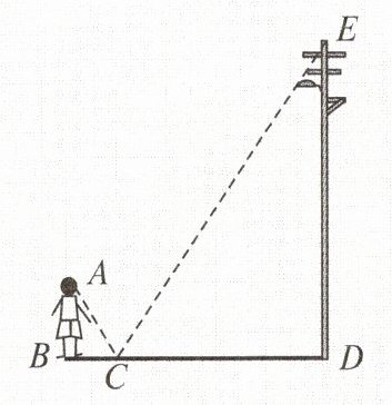 2. 如图,小明在测量电线杆高度的实践活动中,发现地面上有一摊积水,他刚好能从积水中看到电线杆的顶端,测得积水与电线杆底部距离 $ CD = 6m $,他与积水的距离 $ BC = 1m $,他的眼睛距离地面 $ AB = 1.5m $,则电线杆的高度 $ DE $ 是多少米?