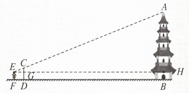 【例题】如图,小明欲测量一座古塔的高度,他拿来一根竹竿竖直插在地面上,然后自己退后,使眼睛通过竹竿的顶端刚好看到塔顶。若小明眼睛离地面 $ 1.6m $,竹竿顶端离地面 $ 2.4m $,小明到竹竿的距离 $ FD = 2m $,竹竿到塔底的距离 $ DB = 33m $,求这座古塔的高度。