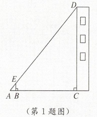 1. 如图,某校数学兴趣小组利用标杆 $ BE $ 测量建筑物的高度,已知标杆 $ BE $ 高 $ 1.5m $,测得 $ AB = 1.2m $,$ BC = 12.8m $,则建筑物 $ CD $ 的高是(