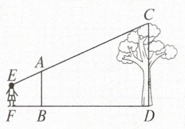 3. 如图,为了测量一棵树 $ CD $ 的高度,测量者在 $ B $ 处竖直立了一根高为 $ 2.8m $ 的标杆,观测者站在 $ F $ 处可以看到杆顶 $ A $、树顶 $ C $ 在同一条直线上,若测得 $ BD = 16m $,$ FB = 4m $,$ EF = 1.6m $,试求树的高度。