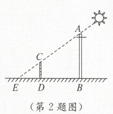 2. 小明希望测量出电线杆 $ AB $ 的高度,于是在阳光明媚的一天,他在电线杆旁的点 $ D $ 处立一标杆 $ CD $,使标杆的影子 $ DE $ 与电线杆的影子 $ BE $ 部分重叠(即点 $ E $,$ C $,$ A $ 在一直线上),量得 $ ED = 2 $ 米,$ DB = 4 $ 米,$ CD = 1.5 $ 米。则电线杆 $ AB = $