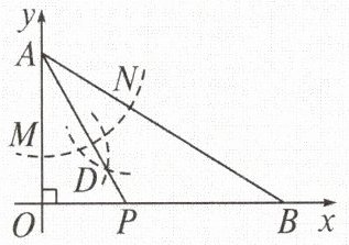 3. 如图,在平面直角坐标系中,点A(0,2),在x轴上取一点B,连接AB,以A为圆心,任意长为半径画弧,分别交OA,AB于点M,N,再分别以M,N为圆心,大于$\frac{1}{2}MN$的长为半径画弧,两弧交于点D,连接AD并延长交x轴于点P。若△OPA与△OAB相似,则点P的坐标为(