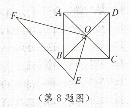 8. 如图,正方形ABCD的对角线相交于点O,Rt△OEF绕点O旋转,在旋转的过程中,两个图形重叠部分的面积是正方形面积的(