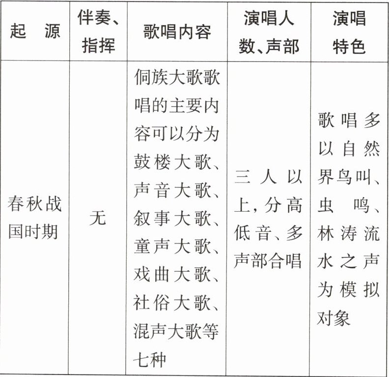 ,距今已有 2500 多年的历史。其歌唱的主要内容可以分为鼓楼大歌、声音大歌、叙事大歌、童声大歌、戏曲大歌、社俗大歌、混声大歌等七种。演唱形式独特,通常由三人以上,分高低音、多声部合唱,但却②无指挥、无伴奏