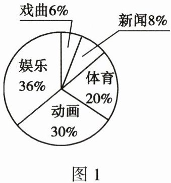 1. (2024·济宁)为了解全班同学对新闻、体育、动画、娱乐、戏曲五类节目的喜爱情况,班主任对全班 50 名同学进行了问卷调查(每名同学只选其中的一类),依据 50 份问卷调查结果绘制成全班同学喜爱节目情况扇形统计图(如图 1 所示). 下列说法正确的是 (