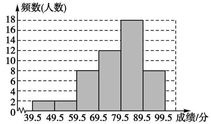 21. (10 分)某校进行信息技术模拟测试,七(1)班的最高分为 99 分,最低分为 40 分. 课代表将全班同学的成绩(得分取整数)进行整理后分为 6 个小组,制成不完整的频数分布直方图,其中在 39.5~59.5 分的学生数占全班学生总数的 8%. 结合图 7 所示的频数分布直方图提供的信息,解答下列问题: