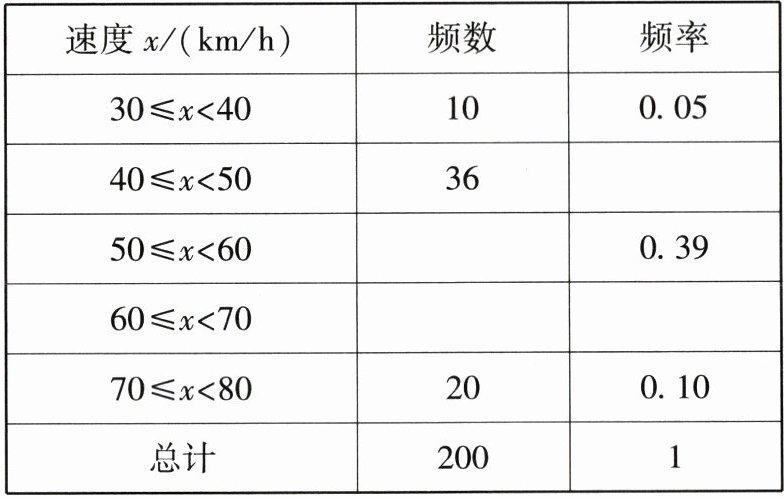 ∴ 速度为60~70的频数为200 - 10 - 36 - 78 - 20 = 56,频率为1 - 0.05 - 0.18 - 0.39 - 0.10 = 0.28.