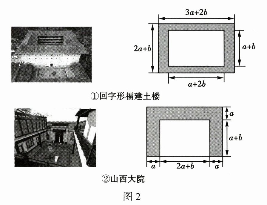 某校同学在社会实践的过程中,遇到了一些各具特色的建筑,有在世界遗产大会上被正式列入《世界遗产名录》的福建土楼,也有被誉为中国民居建筑典范的山西大院,同学们对于哪个建筑的占地面积(图 2 中阴影)更大展开了讨论.
