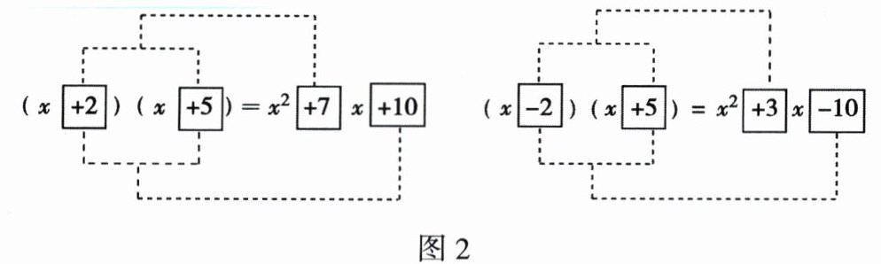 5. 观察如图 2 所示的两个多项式相乘的运算过程,根据你发现的规律推测,若$(x + a)(x + b) = x^{2} - 9x + 14$,则$a$、$b$的值可能分别是 (