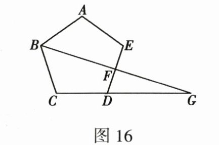 . (2024·广元)如图16,点F是正五边形ABCDE边DE的中点,连接BF并延长与CD的延长线交于点G,则∠BGC的度数为。