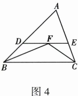 7. 如图4,在△ABC中,已知∠ABC的平分线与∠ACB的平分线相交于点F,过点F作DE//BC,交AB于点D,交AC于点E. 若AB = 9,AC = 7,则△ADE的周长为(