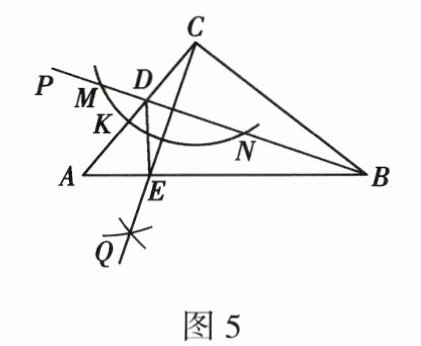 8. (2025·辽宁)如图5,在△ABC中,AB = 16,BC = 12,CA = 10,∠ABC的平分线BP与AC相交于点D. 在线段AD上取一点K,以点C为圆心,CK长为半径作弧,与射线BP相交于点M和点N,再分别以点M和点N为圆心,大于$\frac{1}{2}MN$的长为半径作弧,两弧相交于点Q,作射线CQ,与AB相交于点E,连接DE. 则△DAE的周长为(