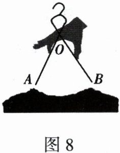 12. 由于木质衣架没有弹性,在挂衣服的时候不太方便操作. 小明设计了一种衣架,在使用时能轻易收拢,然后套进衣服后松开即可. 如图8,衣架杆OA = OB = 16 cm,衣架收拢时,∠AOB = 60°,则此时A、B两点之间的距离是