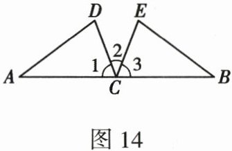 18. (12分)如图14,C是线段AB的中点,CD平分∠ACE,CE平分∠BCD,CD = CE.