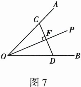 8. 如图 7,点 P 在 $\angle AOB$ 的平分线上,$CD \perp OP$ 于点 F,并分别交 OA、OB 于点 C、D,则 CD 的长度与点 F 到 $\angle AOB$ 两边距离之和的数量关系是 (