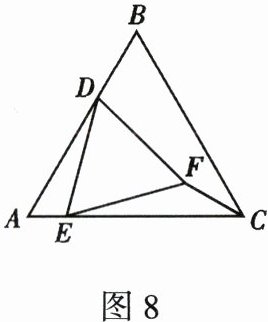 10. 如图 8,在等边 $\triangle ABC$ 中,D、E 分别为 AB、AC 边上的动点,$BD = 2AE$,连接 DE,以 DE 为边在 $\triangle ABC$ 内作等边 $\triangle DEF$,连接 CF,当 D 从点 A 向点 B 运动(不运动到点 B)时,$\angle ECF$ 大小的变化情况是 (