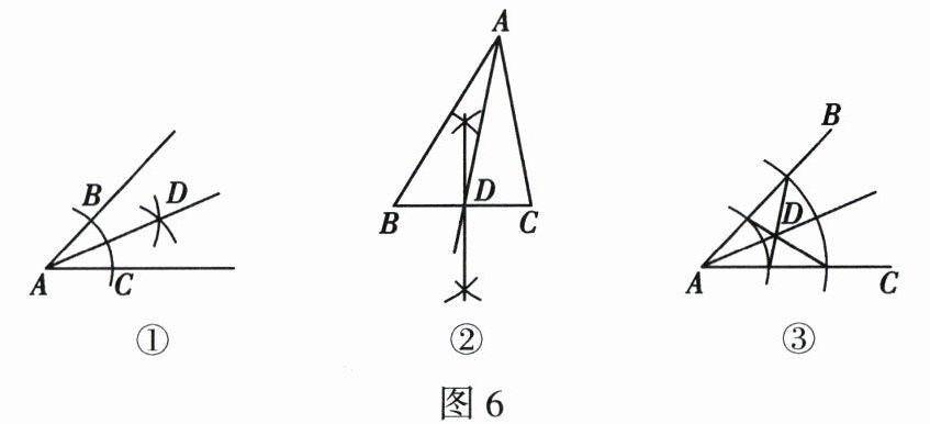 7. (2024·深圳)在如图 6 所示的三个图形中,根据尺规作图的痕迹,能判断射线 AD 平分 $\angle BAC$ 的是 (