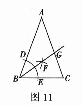 13. (2024·四川)如图 11,在 $\triangle ABC$ 中,$AB = AC$,$\angle A = 40^{\circ}$. 按如下步骤作图:①以点 B 为圆心、适当长为半径画弧,分别交 BA、BC 于点 D、E;②分别以点 D、E 为圆心,大于 $\frac{1}{2}DE$ 的长为半径画弧,两弧在 $\angle ABC$ 的内部相交于点 F,作射线 BF 交 AC 于点 G. 则 $\angle ABG$ 的度数为