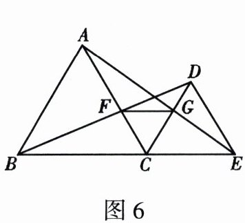 10. 如图 6,已知 $\triangle ABC$ 和 $\triangle DCE$ 均是等边三角形,点 $B$、$C$、$E$ 在同一直线上,$AE$ 与 $CD$ 交于点 $G$,$AC$ 与 $BD$ 交于点 $F$,连接 $FG$,则有下列结论:① $AE = BD$;② $AG = BF$;③ $FG // BE$;④ $CF = CG$。其中正确结论的个数是(