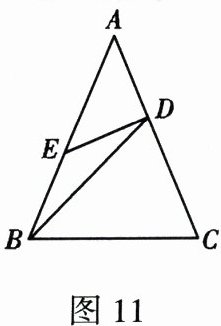 17. (9 分)如图 11,在 $\triangle ABC$ 中,$AB = AC$,$D$、$E$ 分别在 $AC$、$AB$ 边上,且 $BC = BD$,$AD = DE = EB$,求 $\angle A$ 的度数。