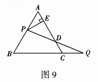 15. 如图 9,过边长为 4 的等边 $\triangle ABC$ 的边 $AB$ 上一点 $P$,作 $PE \perp AC$ 于点 $E$,$Q$ 为 $BC$ 延长线上一点,当 $PA = CQ$ 时,连 $PQ$ 交 $AC$ 边于点 $D$,则 $DE$ 的长为