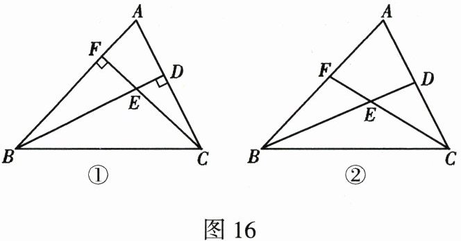 (1)若 $BD \perp AC$,$CF \perp AB$,如图 16①所示,试说明 $\angle A + \angle BEC = 180^{\circ}$;