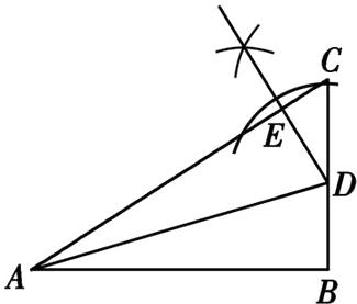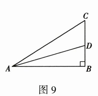 22. (10 分)如图 9,在$Rt\triangle ABC$中,$\angle B = 90^{\circ}$,$AD$平分$\angle BAC$。在小智他们刚学完“三角形全等的判定”这节课后,老师给出了一个富有挑战性的题目:利用所学知识推导出$\triangle ABD$和$\triangle ACD$面积的比值与边$AB$和$AC$长度的比值之间的关系。经过小组讨论,他们的总体思路是控制变量法,即过点$D$作$AC$的垂线,垂足为点$E$,再根据三角形全等来证明$\triangle ABD$和$\triangle ACD$的高相等,从而得到结论。请根据小智他们的思路完成以下作图与填空: