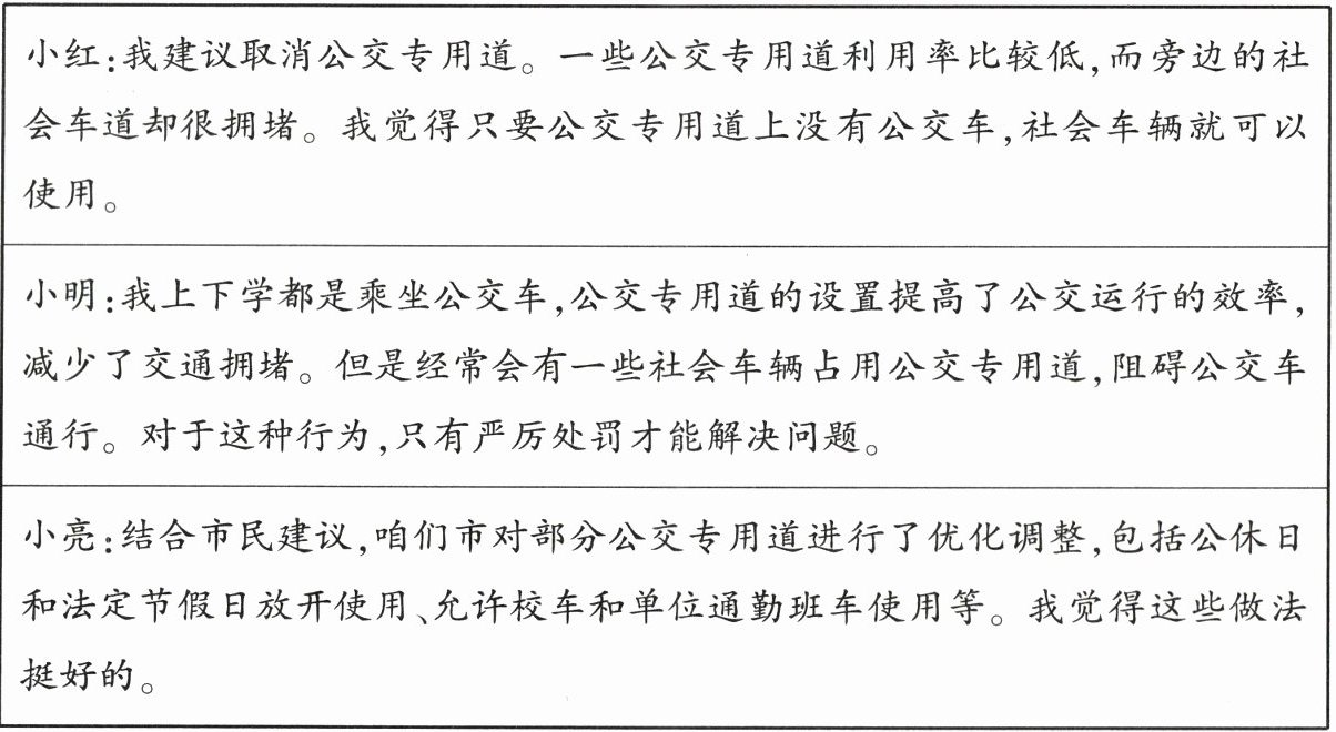 8. 在城市部分道路上,我们常常可以看到公交专用道。对于公交专用道,同学们表达了不同看法。