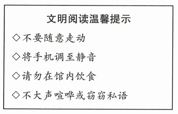 4. 去图书馆阅读学习已经成为当下许多人充实自我、提升素养的一种生活方式。小举动展现大文明,下面图书馆“文明阅读温馨提示”展现的是(
