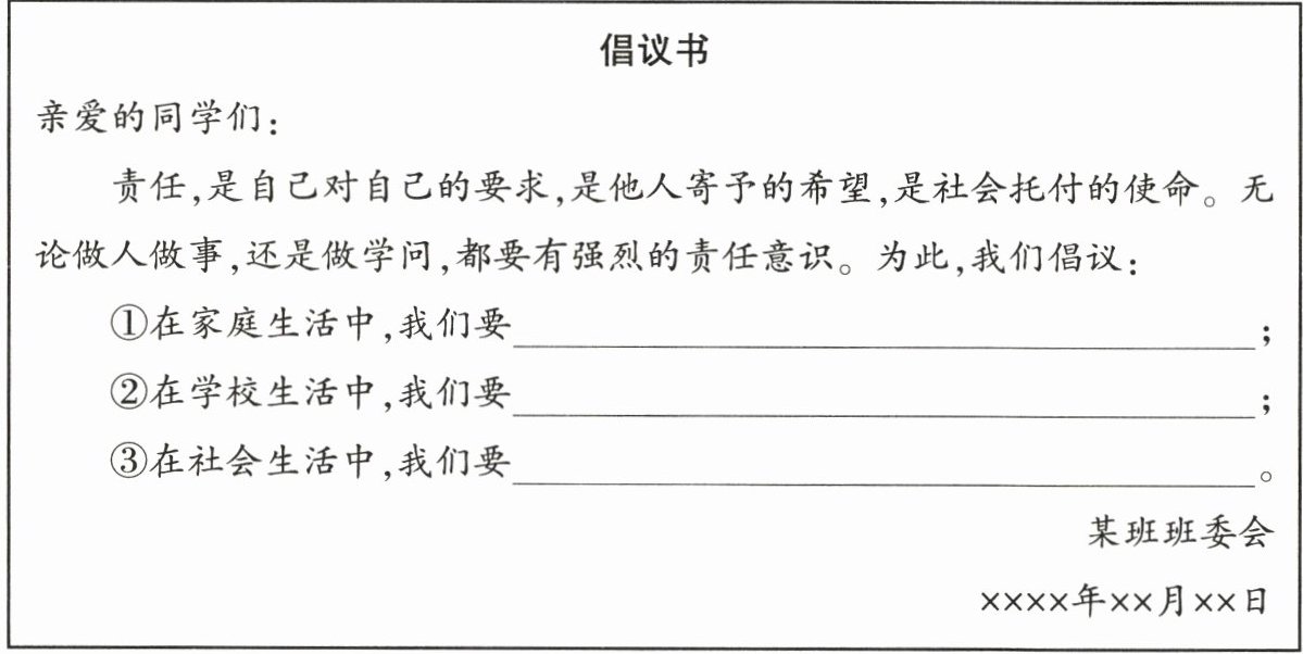 (2)为了倡导大家做有责任心的人,班委会准备向全校同学发出倡议。请把下面倡议书的内容补充完整。(6分)