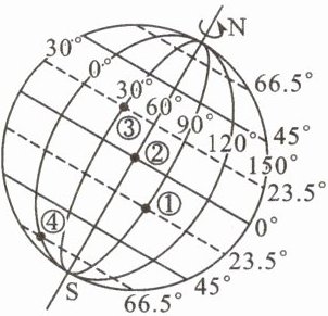 (1)图中①②③④四地位于本初子午线上的是