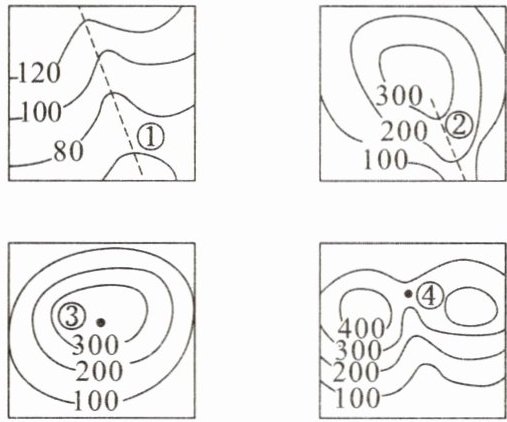 5. 下列是山地不同地形部位的等高线(单位:米)示意图,其中表示山脊的是(