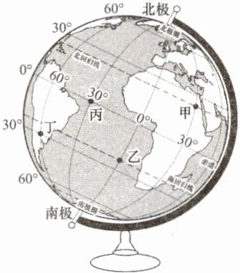2. 图中甲、乙、丙、丁四地中,既在西半球又在南半球的是(