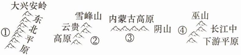 (3)巫山 横断 大兴安岭、太行山脉、雪峰山、武夷山脉、长白山脉等 贺兰山脉、六盘山等